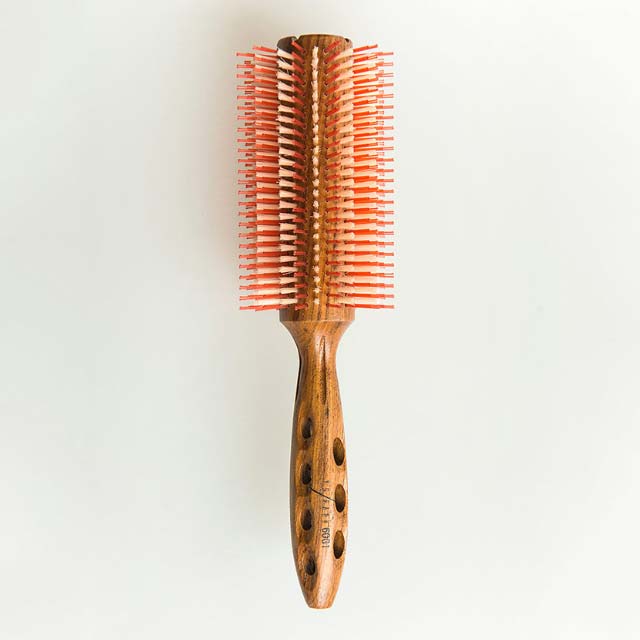 風通しを良くしてブロー時間を短縮。密に植毛された天然猪毛が髪をしっかりグリップ、キューティクルを閉じて髪本来のツヤを。またブラシ本体と隙間を作る事でドライヤーの風が早く抜けます。長めの耐熱ポリミドピンは毛をブラシの上でクシの様に毛の流れを安定。ドライヤーの当て方次第でスピーディーにカール、径の大きいのでストレートにも最適。